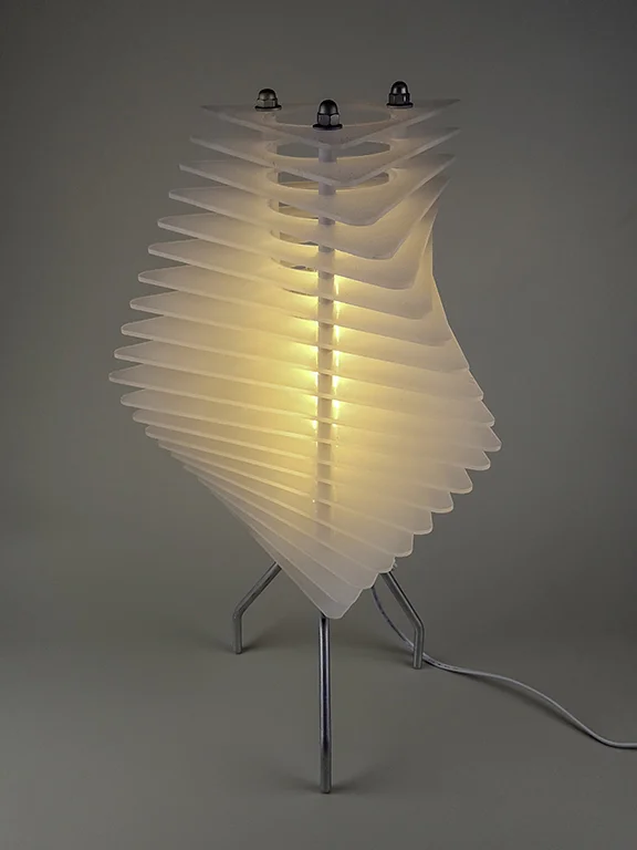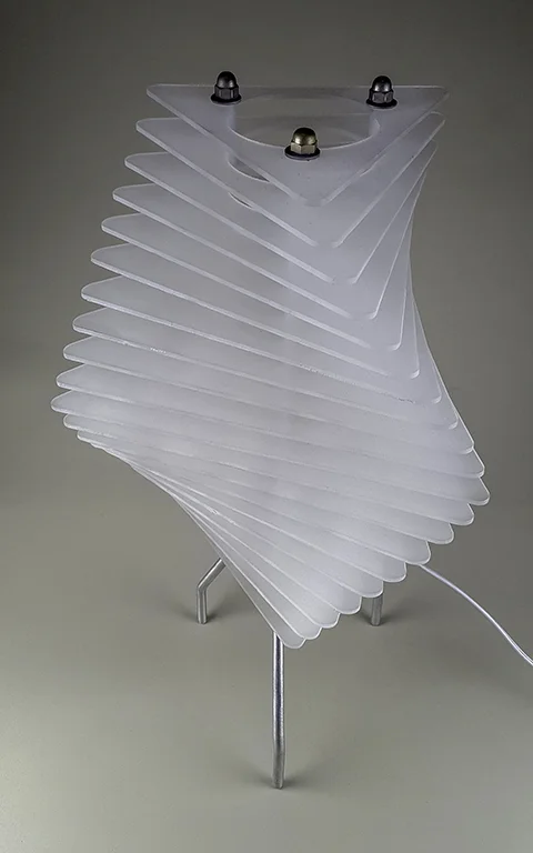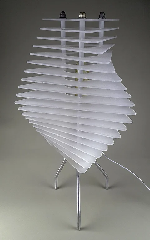 laser-cut 3/16" acrylic sheet, steel threaded rod, zinc plated hardware, 5/16" aluminum rod, lamp hardware.